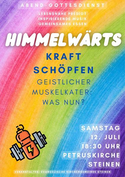Der Himmelwärts-Gottesdienst findet einmal im Monat in der Petruskirche in Steinen statt: Samstagabend um 18:30 Uhr. Parallel mit Kinderprogramm.